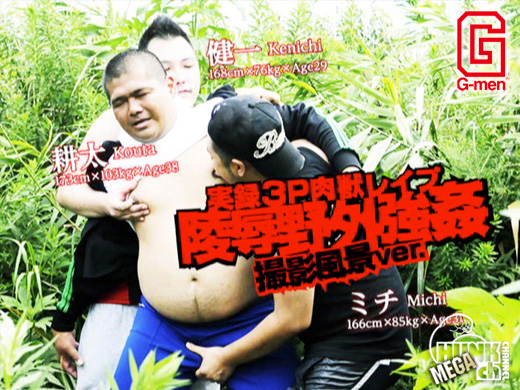 | 重量級イモ系兄貴・耕太 Kouta(173cm×103kg×38歳)が、健一 Kenichi(168cm×76kg×29才)とミチ Michi(166cm×85kg×31才)に襲われて、大胆にも野外でサカりまくる3P交尾のメイキングシーン!どエロい撮影の合間の雰囲気や、耕太への私性活インタビューも合わせて収録!