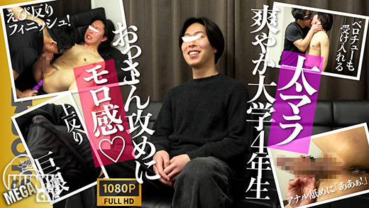 | そろそろモデルが来る時間...しばらくすると、「ピンポーン!」チャイムが鳴り彼が入ってきます。「めっちゃ久々やん!」「お久しぶりです」顔は若干痩せて顎はシャープになり髪の毛も伸びてなんだか垢抜けた爽やか青年に...実を言うと彼が大学2年生の頃に2回ほど会っているんです。まさに2年ぶりの再会!とは言え彼はオマ◯コ大好きなノンケ学生。カメラ回しっぱなしでさっそくiPadを渡しエロ動画鑑賞に...おじさんの話なんかそっちのけで動画を見入る彼...どうやらこの日のために1週間禁欲してきたそうです。そのせいかGパンの上から触ると...すでにカッチカチ!パンツにさせると真上に反り立つ太マラ!その後はスタッフのされるがまま濃厚キスにフェラ攻めには「あぁ...やばい...気持ちいい...」とモロ感状態!さらにケツ舐めラストは海老反りキスしながらの腰振りは圧巻のエロ!ラストは快感の限界で絶頂を迎えます!