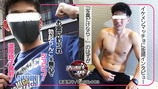| 昨今は鍛える若者が急増しているという事で、そんなイケメン体育会系男性たちにインタビューと称した偽企画をたくらみエッチな事に引きづりこんじゃおうというもの。そして一発目の男性は目がクリっとした爽やか好青年のような筋肉質男性を発見!声をかけると丁寧にインタビューに答えてくれる男性。せっかくなので写真を撮らせてほしいとお願いすると「写真だけなら、、」と言う事で場所を移すことに。写真を撮り終えさらなる交渉を試みるスタッフ。下半身も少し見せて、おおきくなる??など下の誘いに出始める。さすがに拒否するかれだがお金につられ最終的には勃起ちんこを無心でシコシコ!だが全然大きくならない為スタッフが扱くとムクムク大きくなり始めた!?男性相手でも気持ちよければ男性は勃起してしまう??しっかりと濃厚精子を出し、イケメン筋肉質男子の射精シーンをGET!!